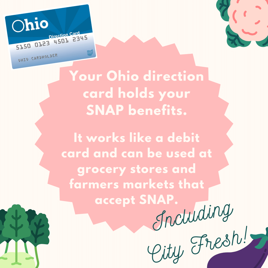Your Ohio Direction Card can be used in most grocery and convenience stores in Ohio. You can also use your benefits online when purchasing food from Walmart and Amazon online, and you can pay for your City Fresh share with your SNAP benefits. There are farmer’s markets in Cuyahoga and Lorain counties that accept SNAP, too!