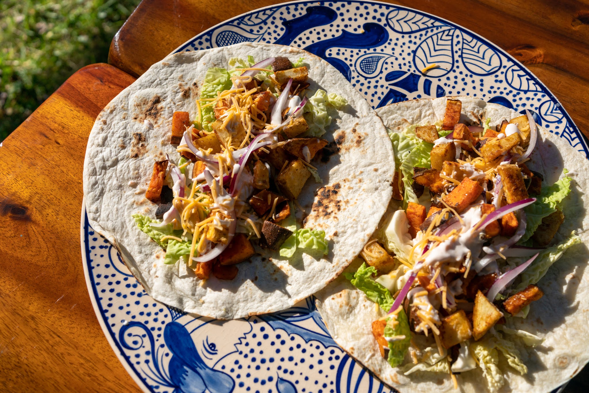 - Fill each tortilla with roasted sweet potatoes, sautéed red onions, and shredded lettuce.