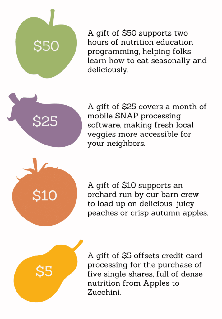 Your gift is 100% tax deductible and will further our mission to build a more healthy and equitable foods system here in our region and beyond.