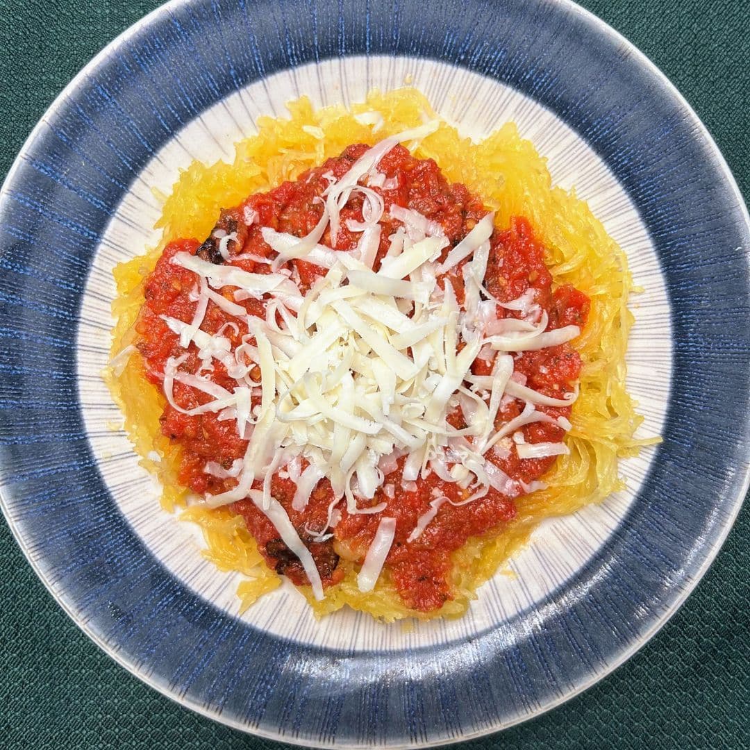 7. Divide the spaghetti squash strands between plates or bowls. Spoon the tomato sauce over the squash.