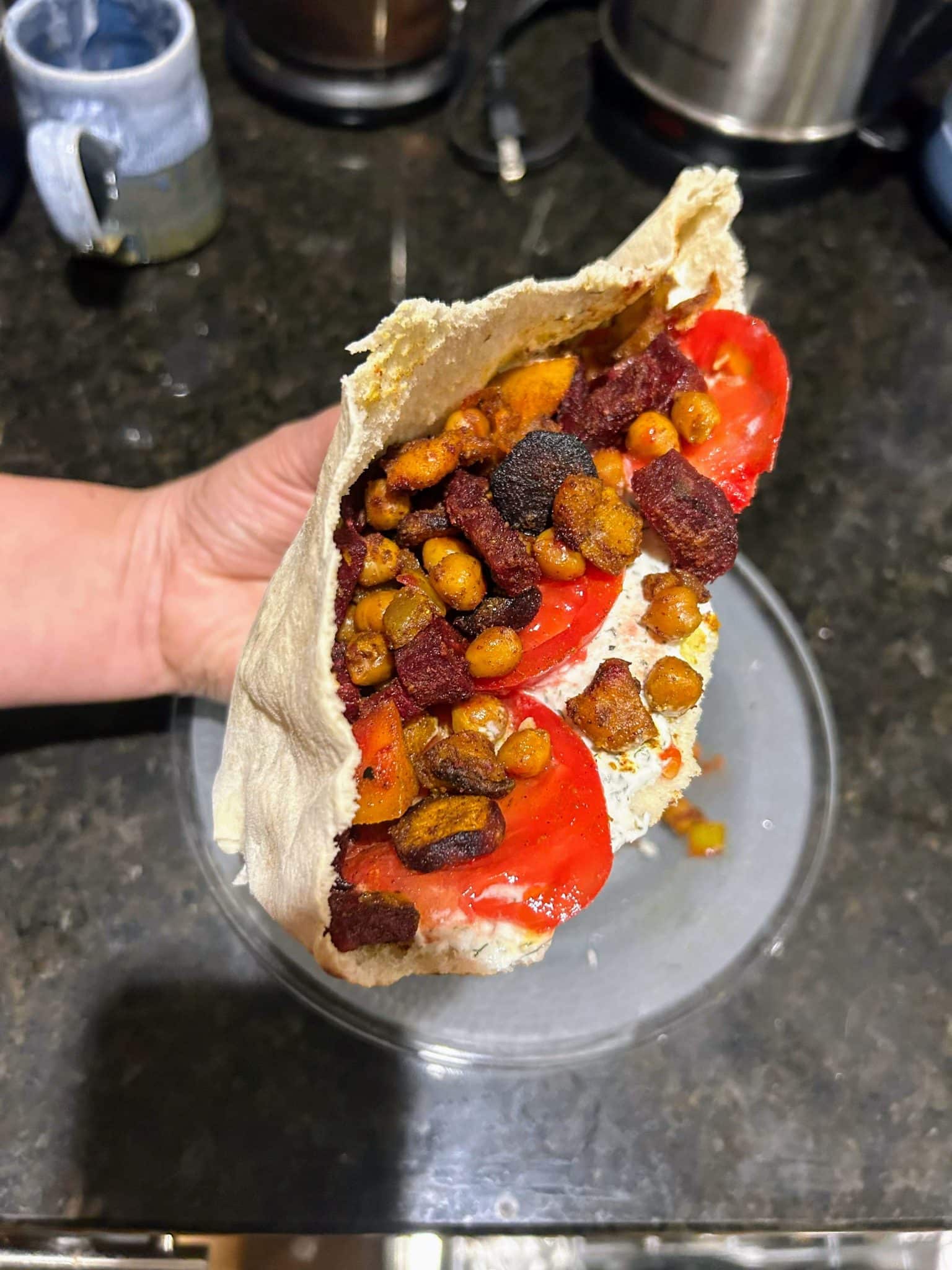 5. Lay a warm pita or flatbread on a plate. Add a handful of lettuce or arugula, a few spoonfuls of the roasted chickpea-vegetable mixture, cherry tomatoes, cucumber slices, and pickled onions or pickles if desired.