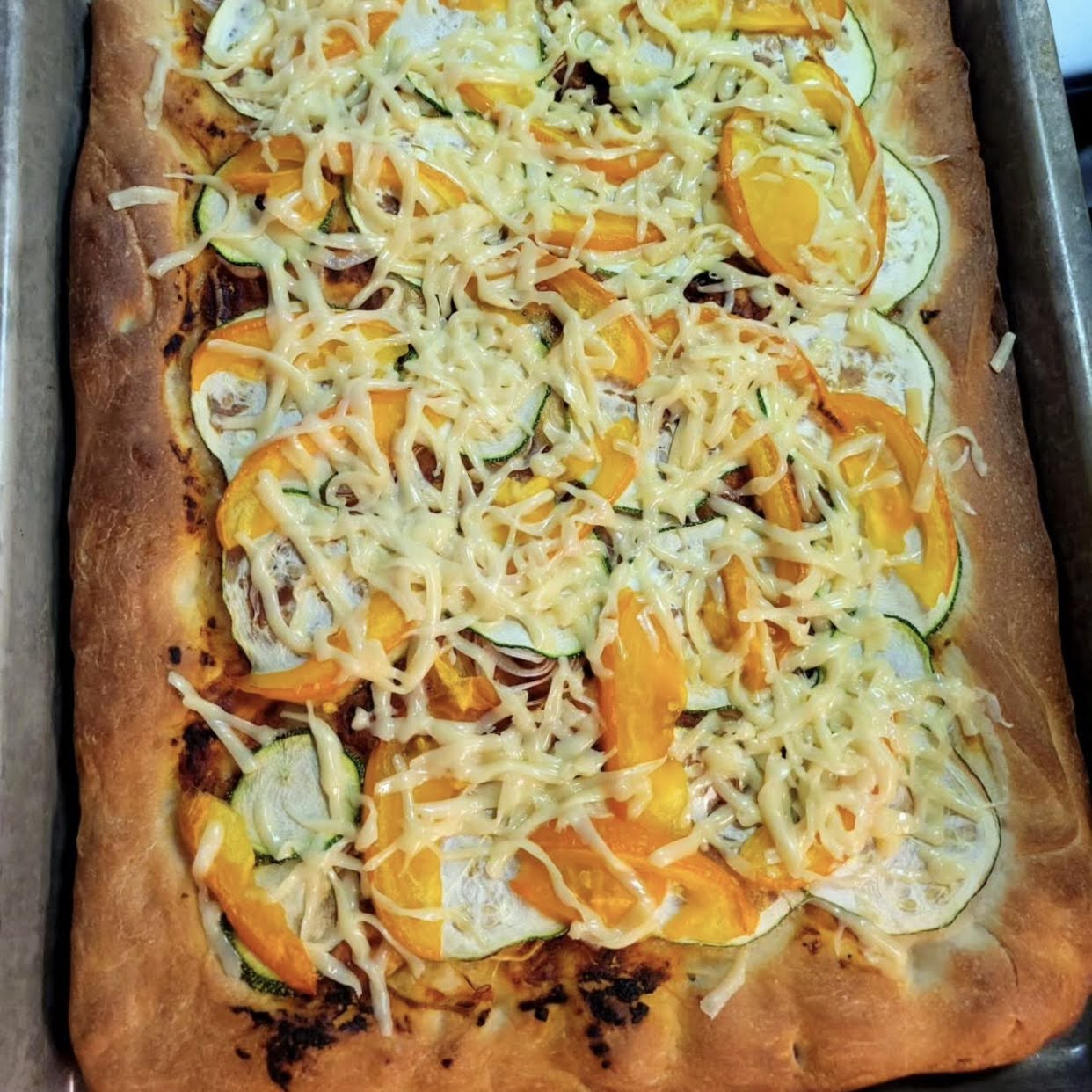 - Spread the remaining 2 tablespoons of olive oil over the surface of the dough, then spread the garlicky ricotta on top in a thin layer. Add the mozzarella and half the Parmesan, then the zucchini, onions, and tomatoes followed by the rest of the Parmesan.